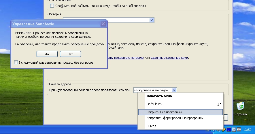 Иногда бывает, что какое-либо приложение зависает. Чтобы закрыть его/их необходимо щелкнуть по значку Sanboxie и выбрать Закрыть Все программы.